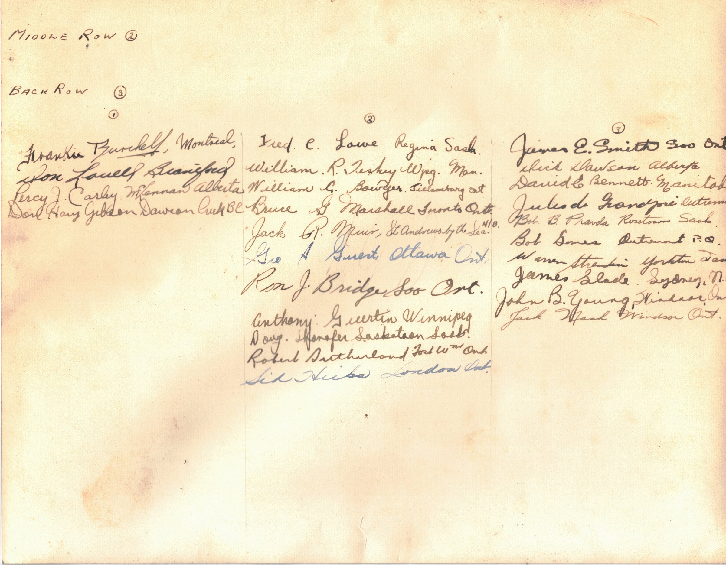 (6) M. Malone, Edmonton, AB (7) E.F. Collins, Saskatoon, SK (8) R.G. Donmoyer, Woodstock, ON (9) Jack Wight, Rodney, ON (10) PO Tel William ????? (11) ?? Marquort (12) St. Posmituk, Port Arthur, ON (13) J.D. Davies, Windsor, ON (14) Jim Friend, New Westminister, BC (15) G. Berubé, Montreal, QC