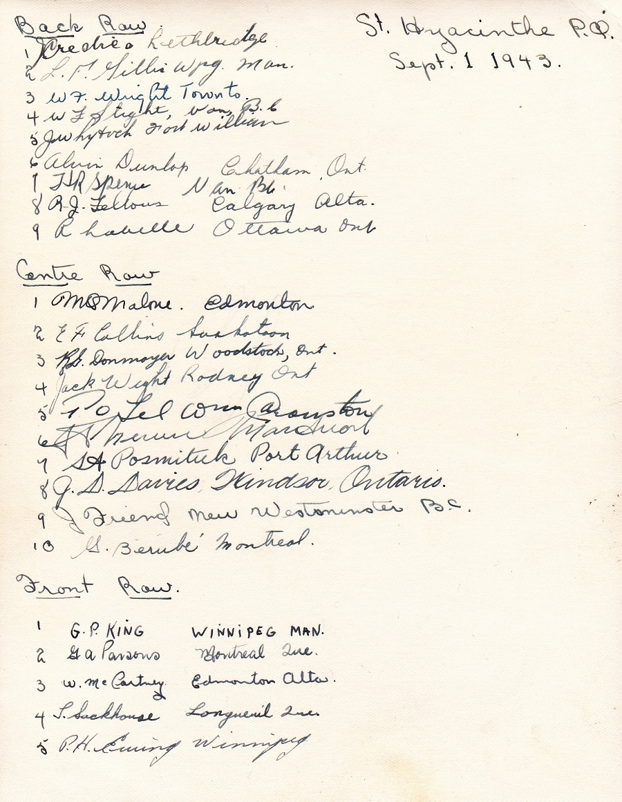 (1) Dyment, John Theodore (2) Brown, E. B. (3) Hampel, L. E. (4) Merryweather, Bruce (5) Purvis ?sp (6) Harbron, Edward Lewis (7) Warner (8) Marshall, C. G. (9) Vincent, Jack Clifford (10) Jean, Harvey J. (11) Scott (12) Unknown (13) Demers (14) Romanchuk, William (15) Nordley ?sp (16) Tucker (17) Webster, T. G. (18) MacMillan, John (19) Chase, Marcel (20) Comby, Ken (21) Maistro ?sp (22) Legge, K. A. (23) Acton, Raymond Alexander