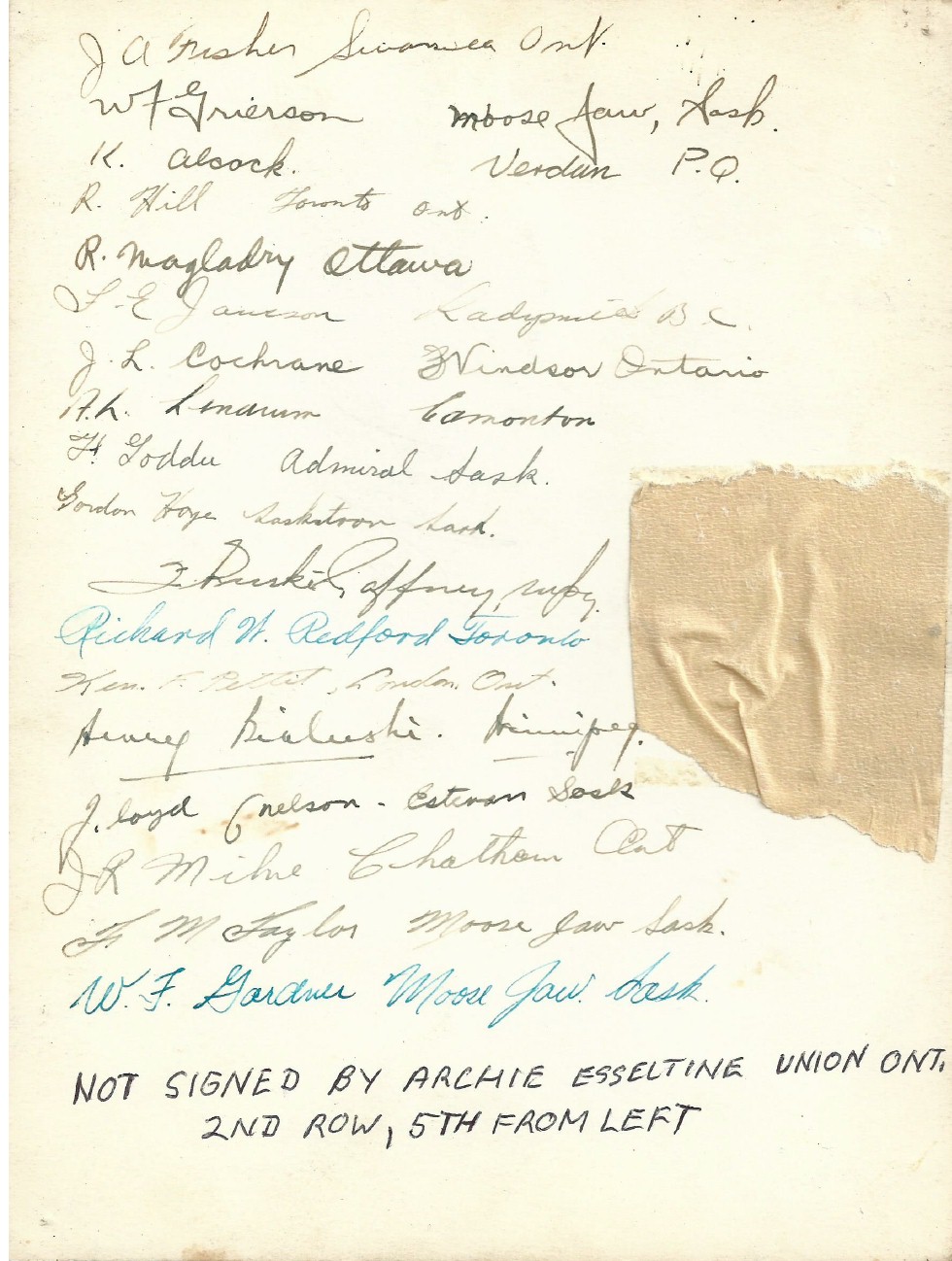 (16) ??, Lethbridge, AB (17) L.F. Gillis, Winnipeg, MB (18) W.F. Wright, Toronto, ON (19) W.F. Slight, Vancouvr, BC (20) J. Whytoch, Fort William, ON (21) Alvin Dunlop, Chatham, ON (22) H.R. Spence, Vancouver, BC (23) R.J. Fellows, Calgary, AB (24) R. Labelle, Ottawa, ON