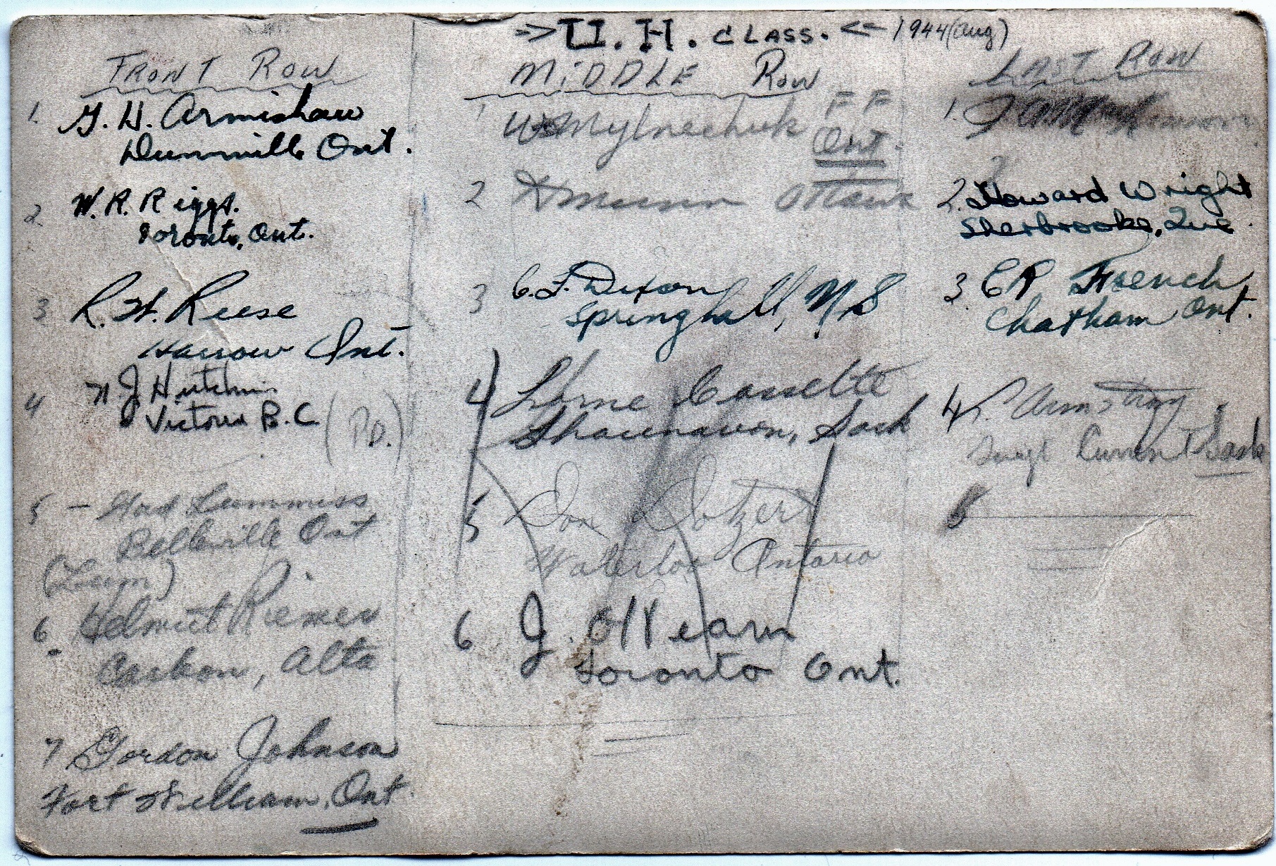 (1) Armishaw, G.W., Dunnville, ON (2) Riggs, W.R., Toronto, ON (3) Reese, R.H, Harrow, ON (4) Hutchins, N.J., PO, Victoria, BC (5) Lummiss, Gord (Lyn), Bellville, ON (6) Riemer, Helmut, Carbon, AB (7) Johnson, Gordon, Fort William, ON