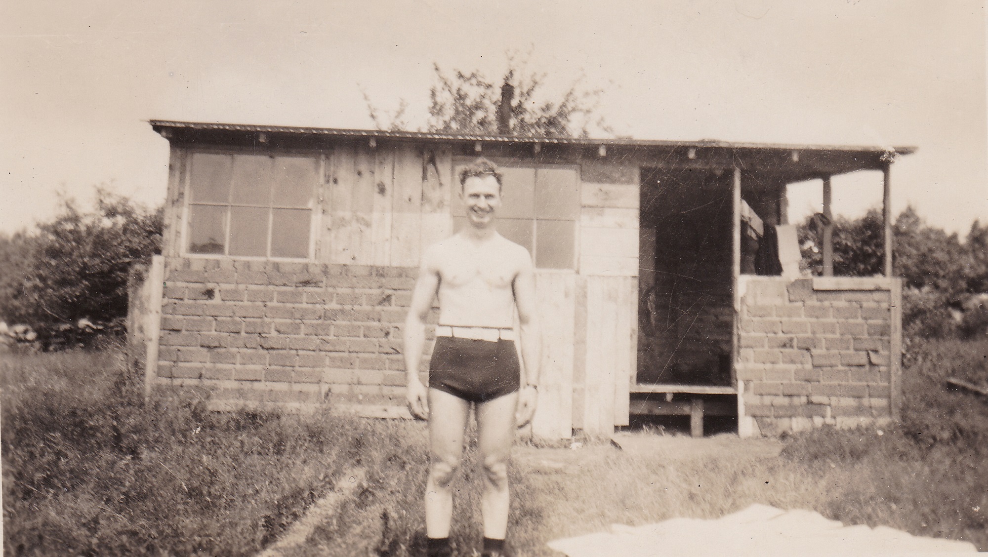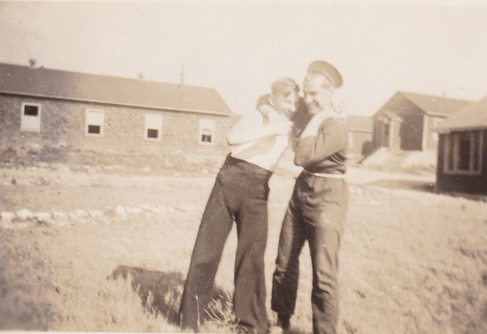 (RAS046) Posing for photos at the barracks construction site at HMCS PEREGRINE. Note the smokestack in the background at Piercy's Supplies Ltd in Halifax. A fire broke out at Piercy's in 1944 and destroyed the 8-facility. (RAS047) Posing for photos at the barracks construction site at HMCS PEREGRINE - Ross Somerville on the right (RAS048) Posing for photos at the barracks construction site at HMCS PEREGRINE - Ross Somerville on the left (RAD049) Ross Somerville posing for photos at the barracks construction site at HMCS PEREGRINE