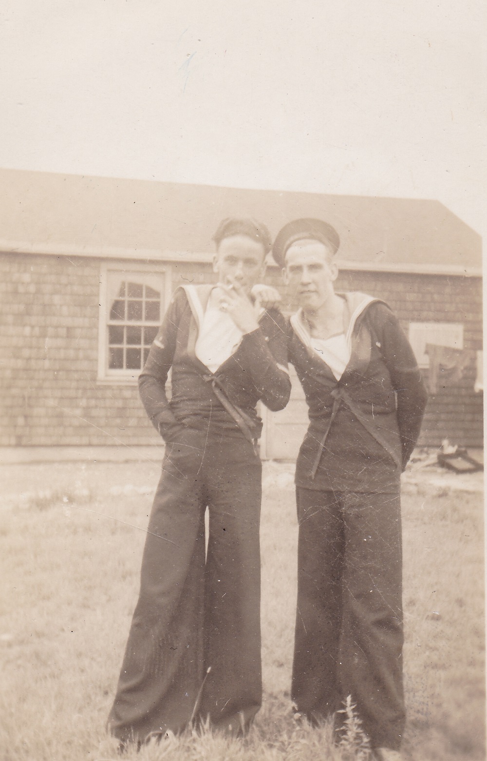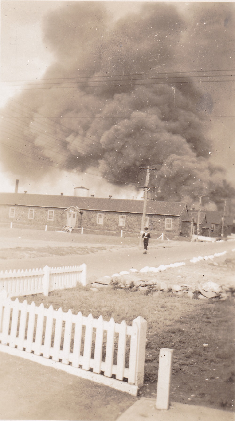 (JC32-JC33) Lumberyard fire just outside the boundaries of HMCS PEREGRINE, Halifax, NS - 1944. The white picket fence is the entrance to the fire hall area at HMCS PEREGRINE - 1944, Halifax, NS (JC34-JC35) Joseph Clulow (right in both photos) with fire hall crew mates at HMCS PEREGRINE - 1944, Halifax, NS