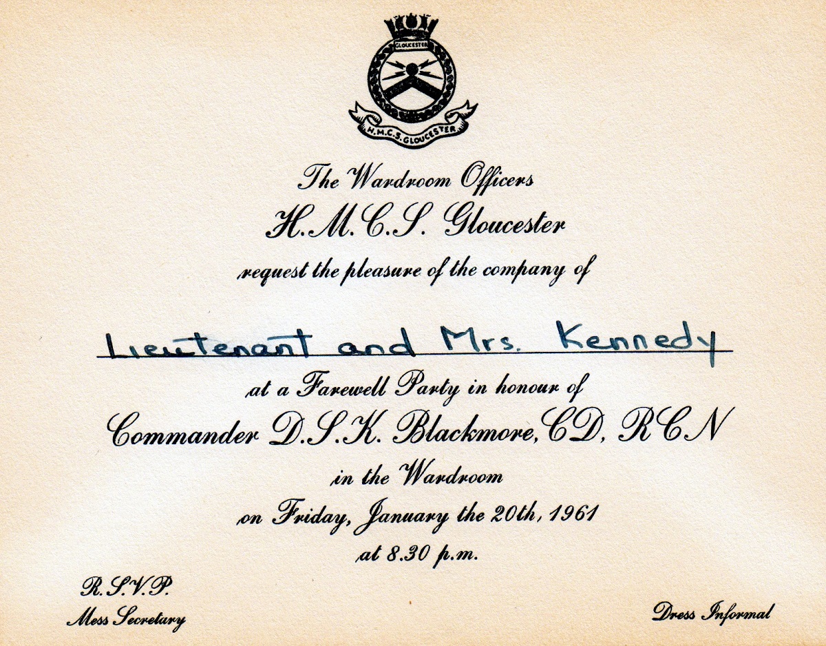 (LK58) Invitation to farewell party for Commander Don Blackmore to be held in Wardroom of HMCS GLOUCESTER on 20 January 1961