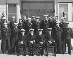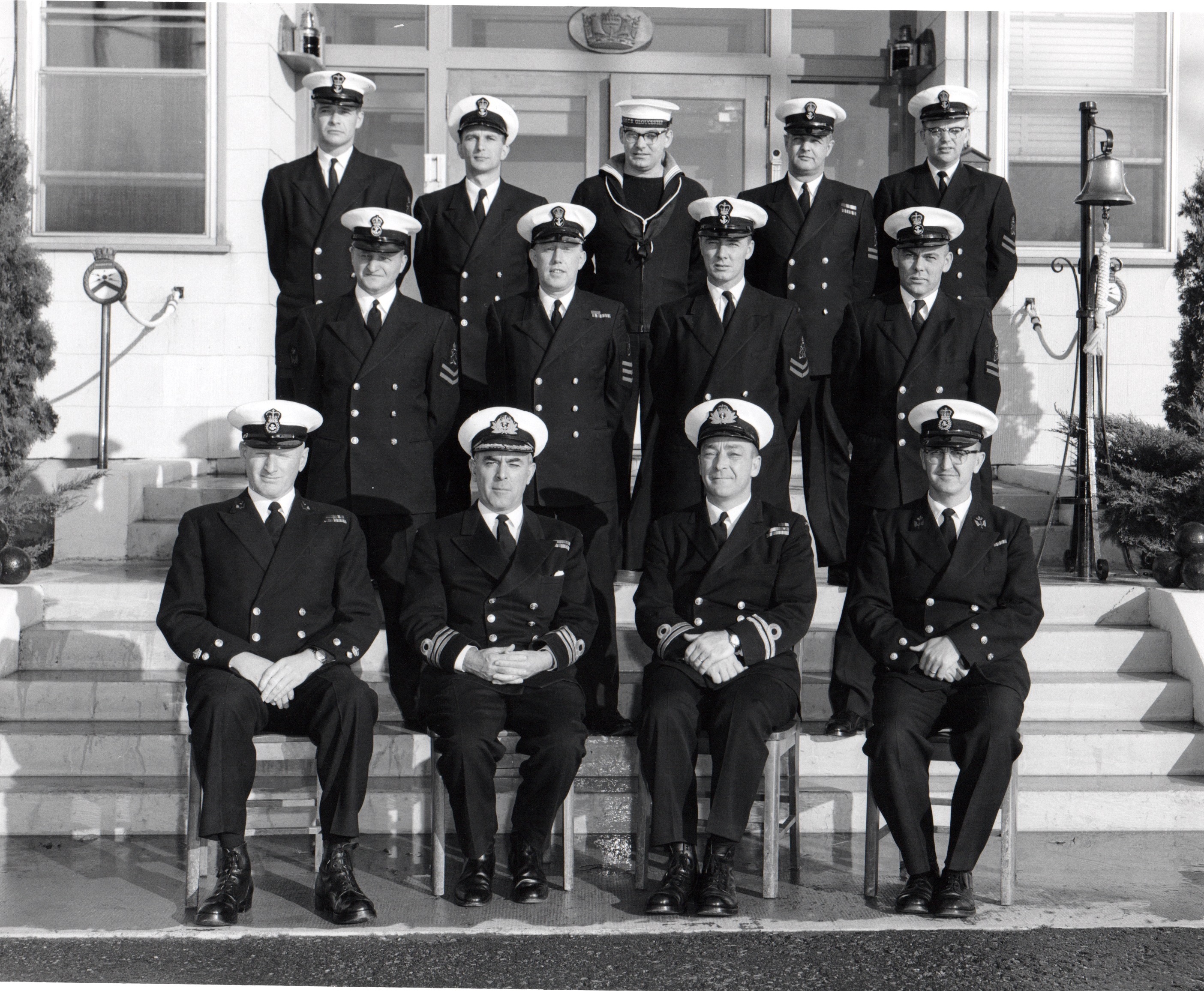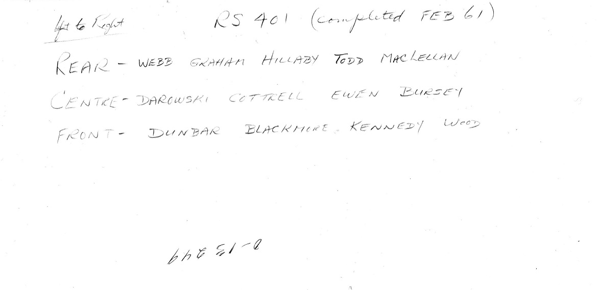 (LK59) RS401 Course, completed Feb 1961. Front L-R:  PO1 'Boots' Dunbar; Cdr Don Blackmore, CO; Lt. Lionel Kennedy, Ops Officer & Course Officer; and CPO Wood  //  2nd Row L-R:  Darowski, Cotterell, Ewen, Bursey  //  3rd row L-R: Webb, Graham, Hillaby, Todd, Maclellan. ( Names on back of photo )