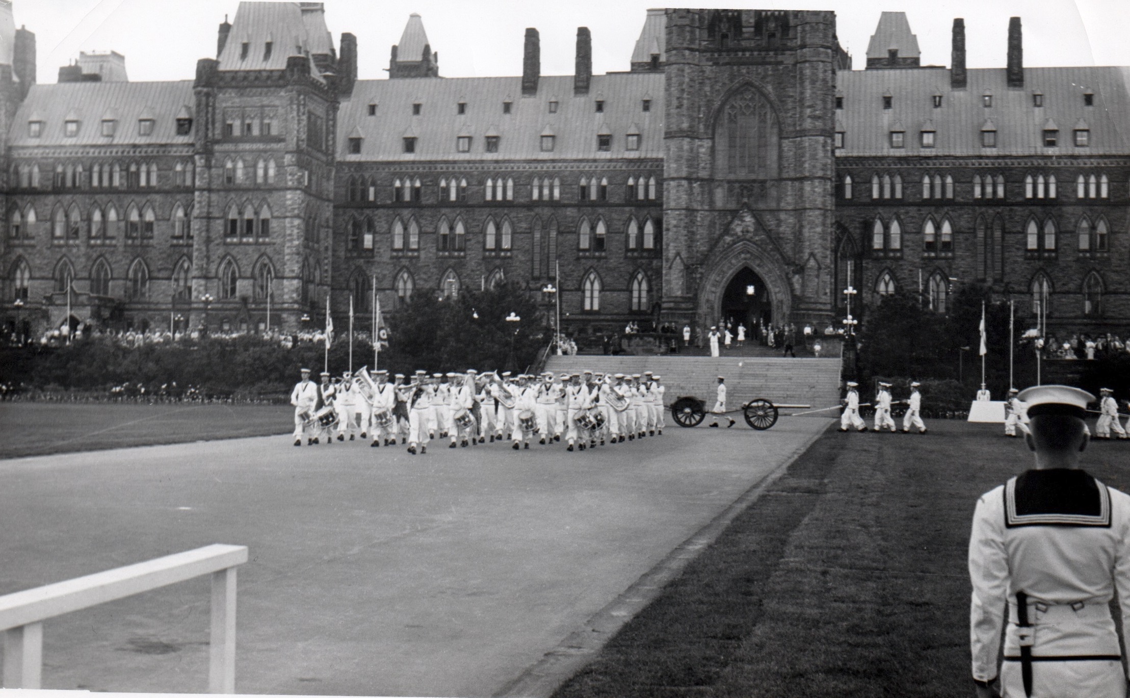 (LK61) HMCS GLOUCESTER sailors performing Sunset Ceremony at Parliament Hill on 1st of July 1961