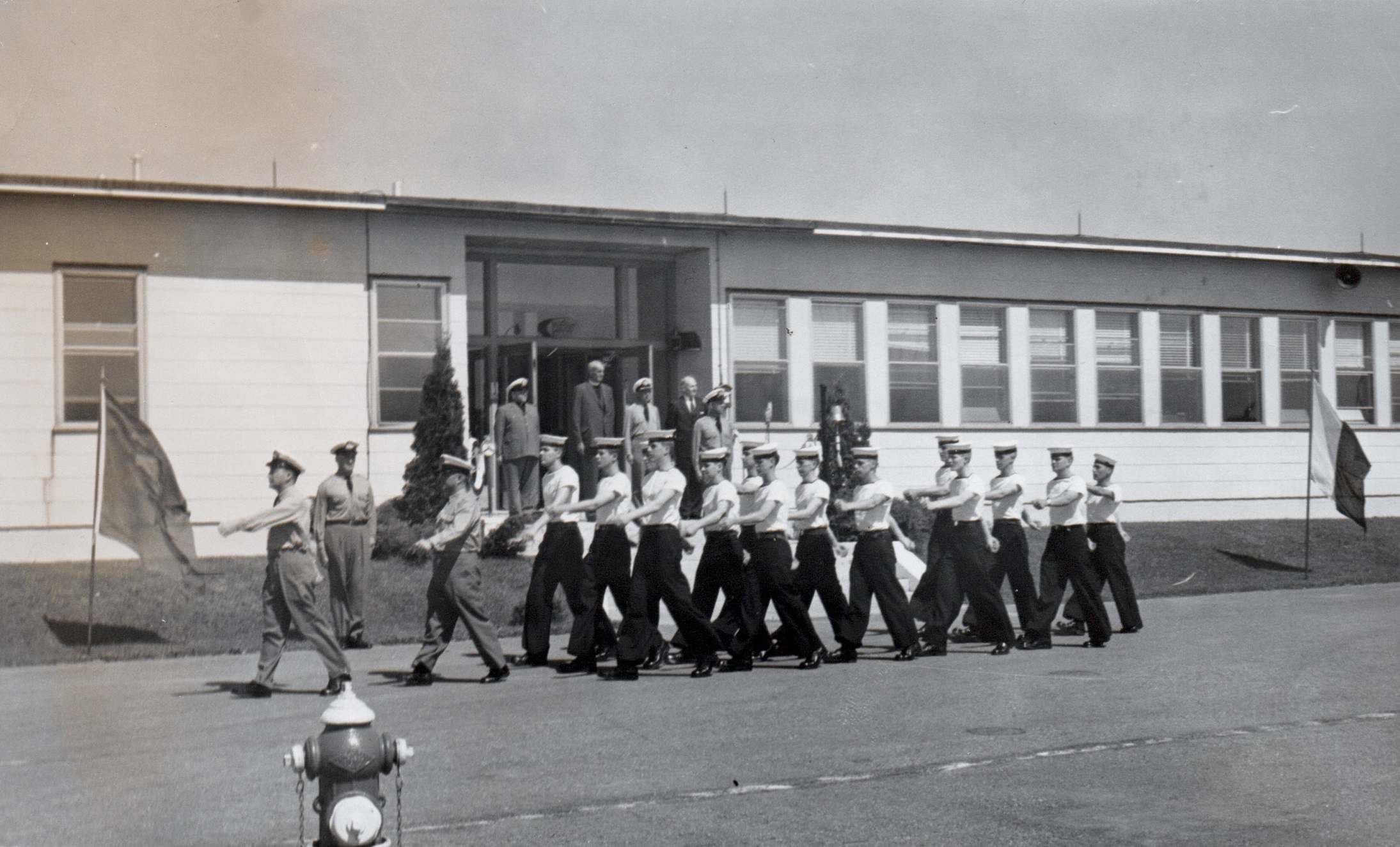 (LK62) Lt Lionel Kennedy, Ops Officer, leading march past in front of the Administration/Training Building at HMCS GLOUCESTER.