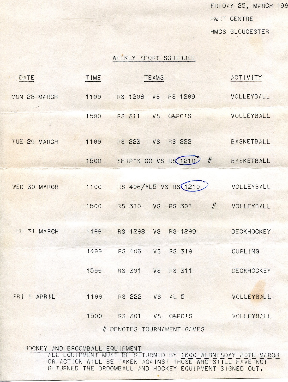 HMCS GLOUCESTER weekly sports scheduled dated 25 Mar 1966
