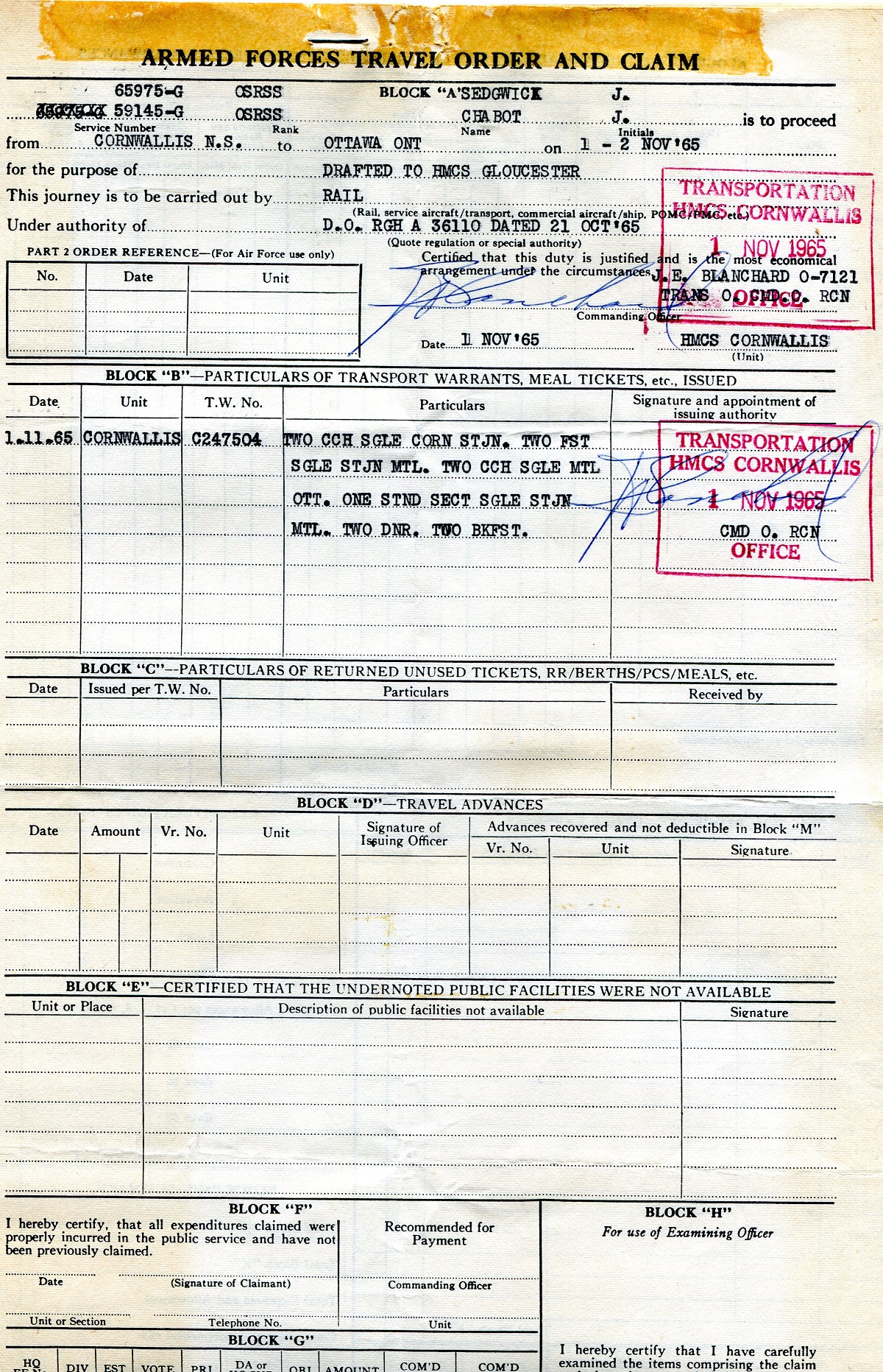 Travel Orders for OS Sedgwick and OS Chabot from HMCS Cornwallis to HMCS GLOUCESTER - Nov 1965