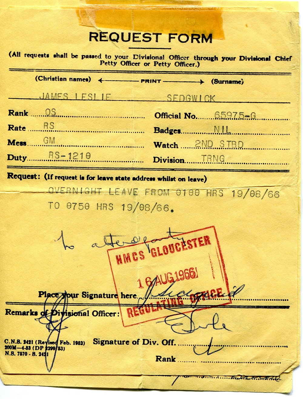 Request for Overnight Leave - OS Sedgwick - 16 Aug 1966 - HMCS GLOUCESTER