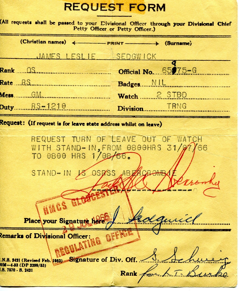 Request for Leave- OS Sedgwick - 29 Jul 1966 - HMCS GLOUCESTER