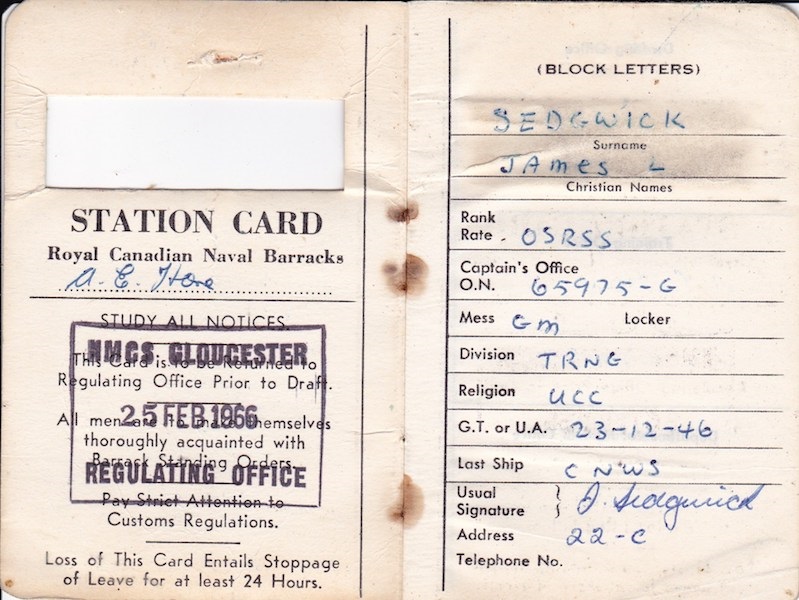 Jim Sedgwick's station card for HMCS GLOUCESTER