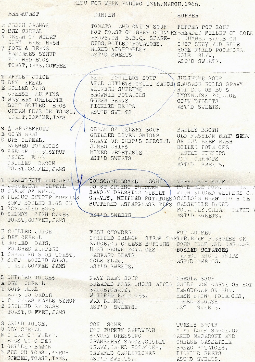 HMCS GLOUCESTER Weekly Menu for the week ending 13 Mar 1966