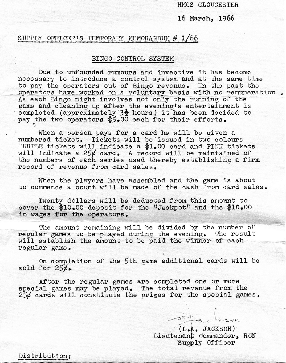 Bingo Control System, HMCS GLOUCESTER, Supply Officer's Temporary Memorandum 1.66 - dated 16 Mar 1966