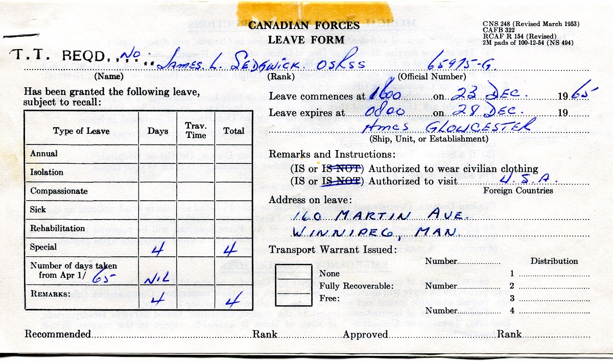 Leave Form - Christmas Leave - OS Sedgwick, 23-28 Dec 1965 - HMCS GLOUCESTER