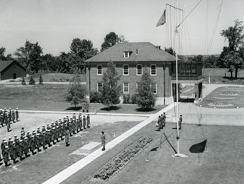 Formerly Bytown II, HMCS Conestoga was the basic training establishment for the Women’s Royal Canadian Naval Service (WRCNS). This was a volunteer service composed of women and was separate from the Volunteer Reserve. It was established for the duration of hostilities on 31 July 1942. The model for the ‘Wrens,’ as they were affectionately known, was based on the Women’s Royal Naval Service (WRNS) in Britain, from which they had inherited the nickname. The goal was for women to take over crucial, non-combat roles to free up men for the fighting. The establishment of the WRCNS was the first time that women served in the Canadian Navy in any capacity other than nursing. While no Wren served in a combat role, or even at sea, by the end of the war Wrens worked in 49 naval trades and had earned an international reputation for conscientious efficiency. Unlike the WRNS, WRCNS officers were the first women in the Empire and Commonwealth to carry the King’s Commission in naval service, holding the same ranks and entitled to the same salutes and marks of respect as male officers.