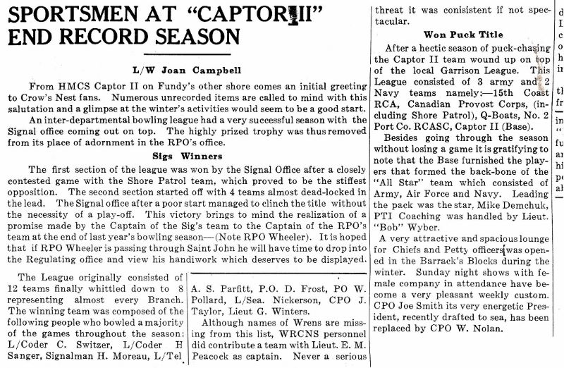 Newspaper article on HMCS Captor II's sports teams Crow's Nest newspaper - May 1945