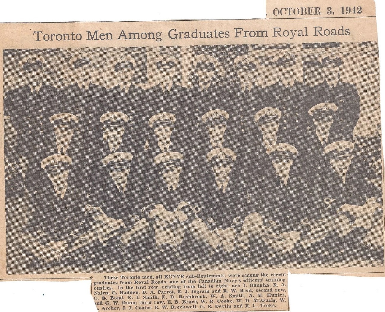 Toronto Men Among Graduates From HMCS Royal Roads - 03 Oct 1942 1st row: J. Douglas, R.A. Nairn, G. Hadden, D.A. Parrot, R.J. Ingram and, R.W. Kent 2nd Row: C.R. Bond, N.I. Smith, E.D. Rushbrook, W.A. Smith, A.M. Hunter and , G.W. Dunn 3rd Row: E.B. Brace, W.R. Cook, W.D. McQuaig, W. Archer, J.J. Coates, E.W. Brockwell, G.E. Devlin and, R.L. Troke