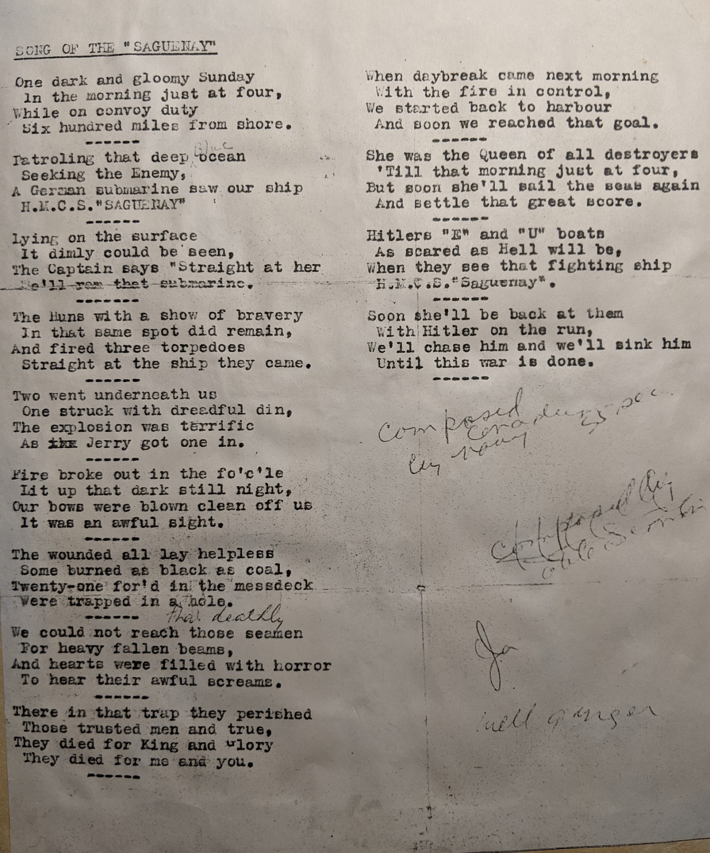 original verses were written in 1936 on the destroyer HMCS SAGUENAY by
